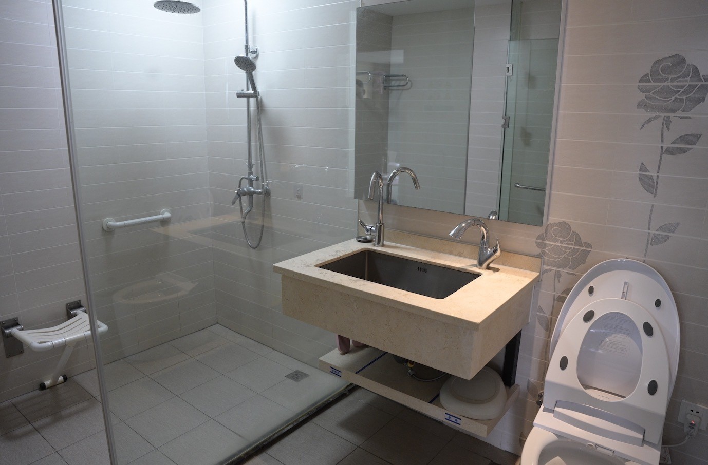 走进家庭化病房,其陈设与卧室几乎无异——按摩椅、导乐椅、微波炉、音箱位于一侧,病床、沙发位于另一侧。床头采用推拉门设计,平时将胎心监护仪等仪器设备置于其中,能减轻孕产妇的紧张心情。墙壁上安有多个大容量橱柜,完全能够放下孕产妇和新生儿所需的各类物品。淋浴间里也为孕产妇设置了专门的座椅,一方面方便借力,另一方面也为孕产妇淋浴镇痛提供了条件。